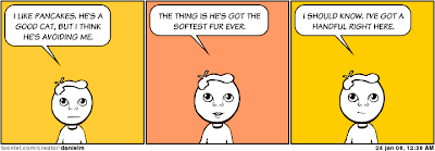 Tiger, grannkatten är här och hälsar på. Han har roat sig med att jaga runt Mickey the dog inomhus och fick bassning. Sedan satt han på bordet och petade runt bland skruvar och muttrar (som hör till Jims belysningsprojekt). Inte så bra. Vare sig för Jim som kommer att behöva dem, eller ur barnsäkerhetssynpunkt. Mer bassning, hotade med utslängning. Katten återgick till att jaga hund istället. Eller snarare slövarianten - han ligger på Mickeys kudde och hotar varje gång Mickey kommer i närheten, och Mickey nappar och springer ett varv. Åtminstone hunden har jättekul, katten har den där "jamen kan du inte lämna mig i fred nu"-minen som bara katter har förmågan till.